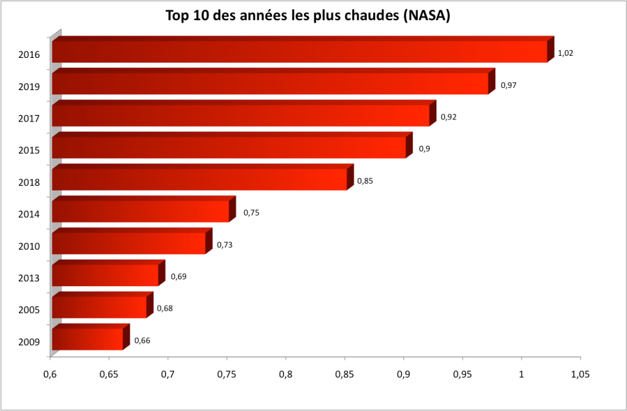 Les chiffres publiés par la NASA sont relatifs à la période 1951-1980 mais on peut aussi calculer les anomalies par rapport aux données les plus lointaines, à savoir la période 1880-1920, une période où les émissions de gaz à effet de serre anthropiques n’avaient pas encore profondément modifié le climat.
