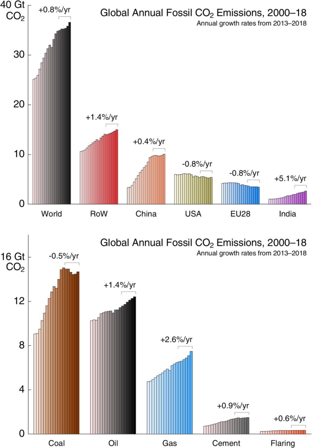À l’échelle globale, le gaz naturel est le combustible fossile qui connaît la croissance la plus rapide. La consommation de gaz naturel a augmenté de 2,6% / an entre 2013 et 2018 et ses émissions de CO2 associées devraient augmenter de 2,5% en 2019 pour atteindre 7,7 milliards de tonnes (contre +0,9% pour le pétrole et une baisse de l’utilisation mondiale du charbon de -0,9% en 2019). Dépendant historiquement de pipelines de transport, le marché du gaz naturel est en train de se transformer en nouveaux terminaux de gaz naturel liquéfié (GNL). Le gaz naturel est une source majeure de la croissance mondiale d’émissions de CO2 et contribue à la croissance de émissions de méthane.