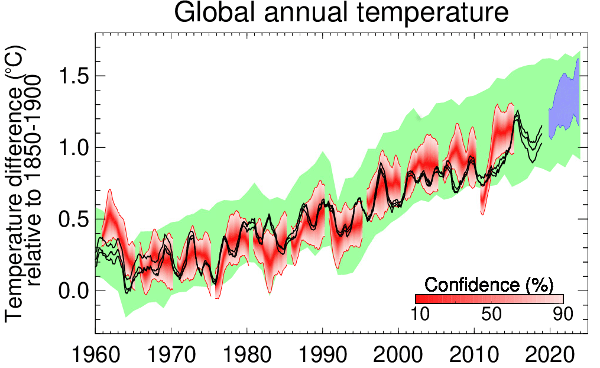 Prises individuellement, les années allant de 2020 à 2024 devraient évoluer dans une fourchette comprise entre +1,06°C et +1,62°C (intervalle de confiance de 90%) par rapport aux conditions préindustrielles (c’est-à-dire la moyenne des températures entre 1850 et 1900). L’année 2015 a été la première où la température moyenne globale a dépassé 1,0°C au-dessus de la période préindustrielle. Lors de l’année record de 2016, l’anomalie a atteint +1,16°C.