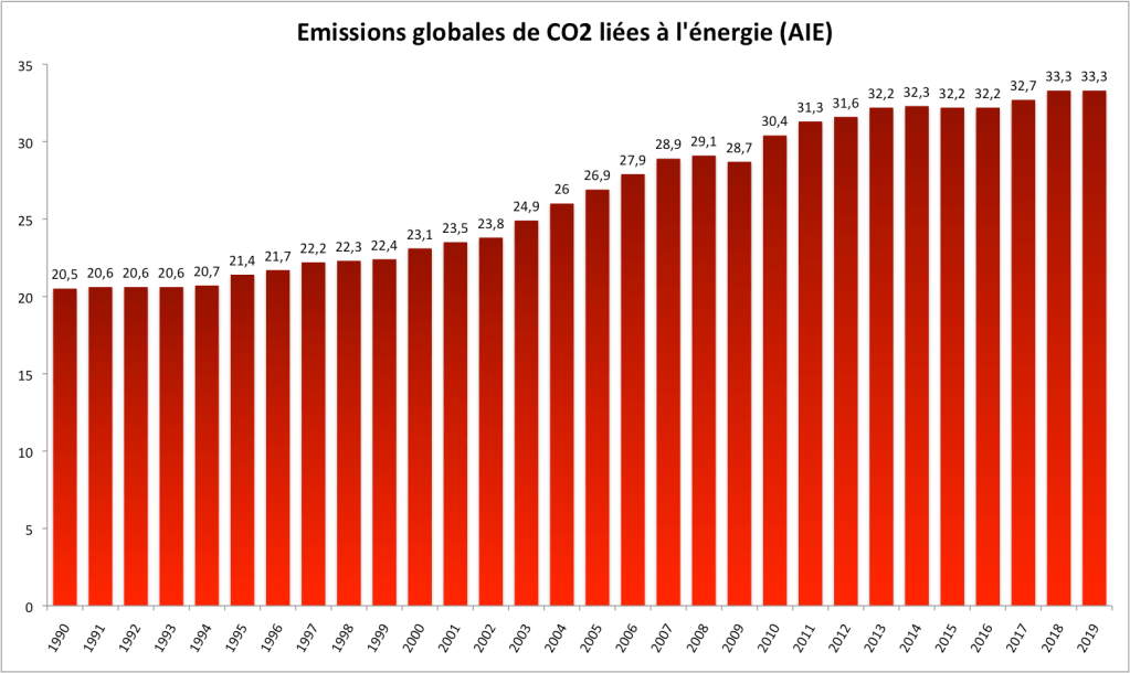 Pour l’AIE, après deux années de croissance, les émissions mondiales liées à l’énergie sont restées inchangées à 33 gigatonnes en 2019 (la différence avec les 37 Gt du Global Carbon Project tient principalement à la production de ciment). Les émissions ont stagné alors que l’économie mondiale a connu une croissance de 2,9%. Les émissions mondiales de CO2 provenant de l’utilisation du charbon ont diminué de près de 200 millions de tonnes (Mt), ou 1,3%, par rapport aux niveaux de 2018, compensant l’augmentation des émissions provenant du pétrole et du gaz naturel. La consommation de charbon est suivie de près en raison des émissions massives de CO2 associées. Les projections les plus pessimistes des modèles climatiques du GIEC impliquent une croissance des émissions de CO2 provenant du charbon et il est absolument impératif de les limiter pour éviter un scénario catastrophe.