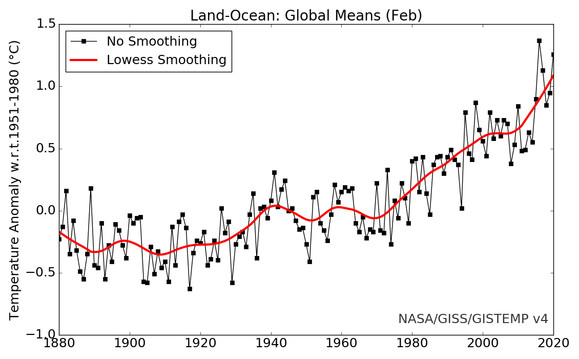 Avec +1,26°C au-dessus de la moyenne 1951-1980, la température observée en 2020 est la 2e plus élevée pour un mois de février depuis le début des mesures de la NASA en 1880. L’anomalie est en hausse par rapport à janvier 2020 (+1,17°C).