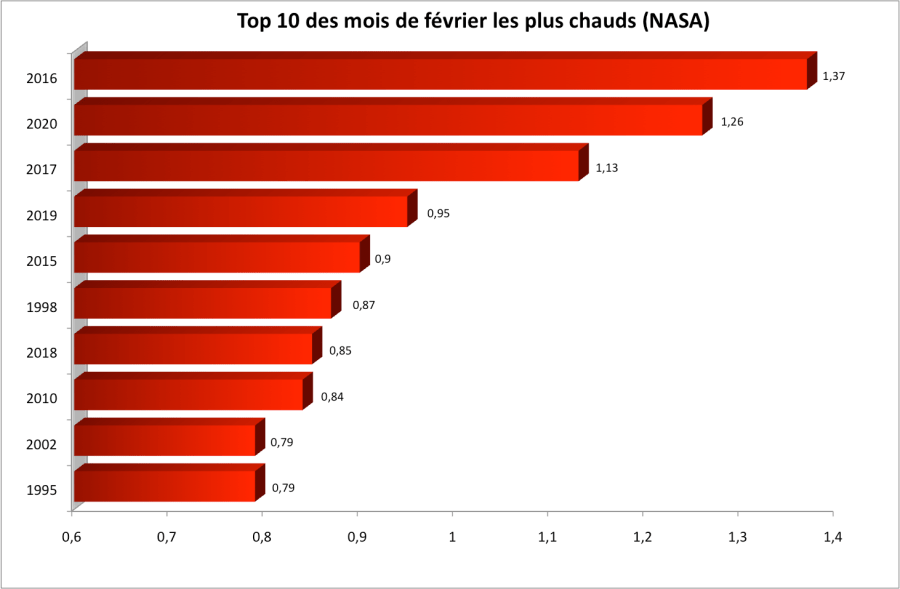 L’anomalie relevée en février 2020 est la 3e plus importante depuis 1880, tous mois confondus, derrière février 2016 (+1,37°C) et mars 2016 (+1,35°C).