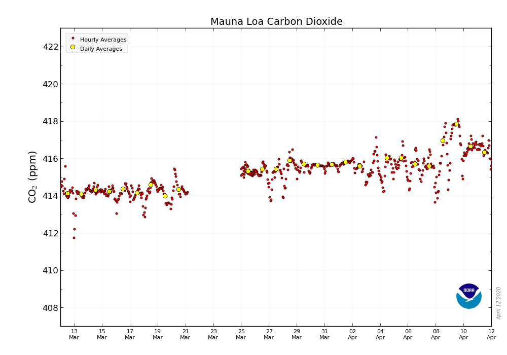 La concentration de CO2 fait l’objet de variations saisonnières avec un pic situé habituellement vers avril-mai. La barre des 415 ppm avait été franchie pour la première le 11 mai 2019. Sur la période récente, la hausse se situe entre 2 et 3 ppm par an. Avec 417,85 ppm le 9 avril, il n’y a donc pas vraiment de signal discernable. D’autant que ce nouveau record est encore susceptible d’être battu d’ici fin mai 2020.