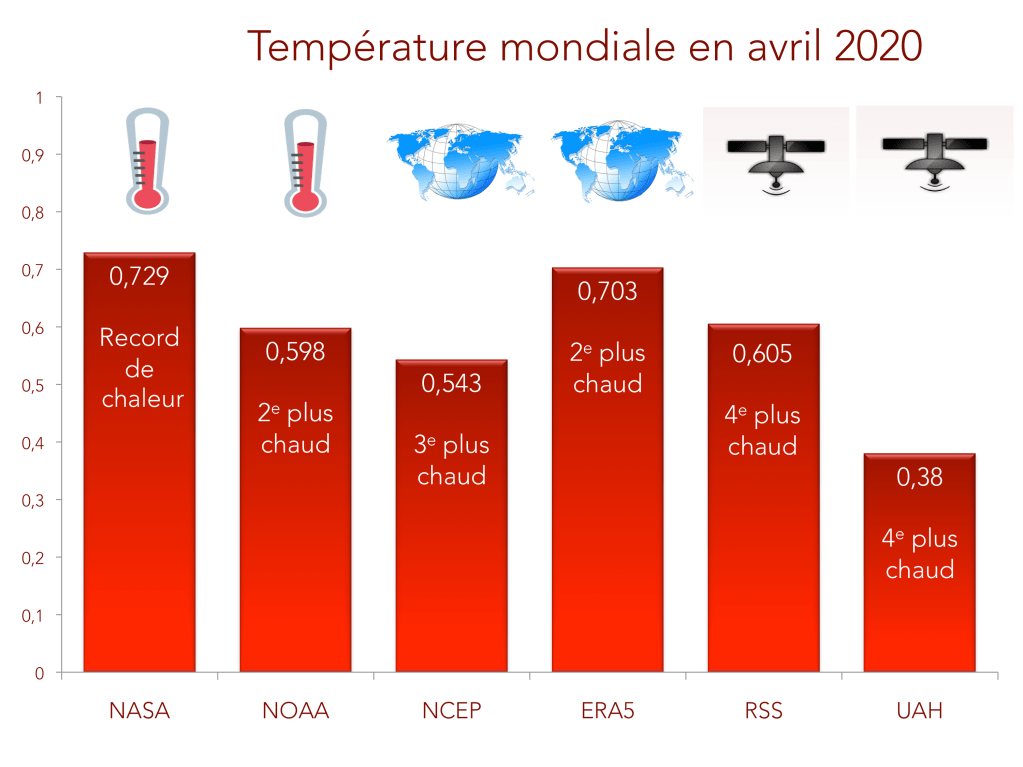 Cette page présente un bilan des archives du mois d’avril issues de six organismes mesurant la température de surface ou de la basse troposphère au niveau global : NASA GISTEMP, NOAA MLOST, NCEP-NCAR, ERA5, RSS, UAH. Ces archives utilisent normalement des périodes de référence et des méthodes distinctes. Les séries sont ici rapportées à la même période 1981-2010 et équitablement représentées selon leur source de récolte des données (thermomètres, réanalyses, satellites).
