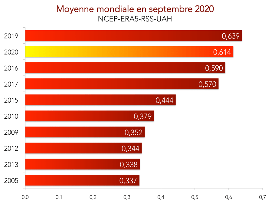 Pour septembre 2020, l’anomalie moyenne calculée avec les données NCEP-ERA5-RSS-UAH, s’élève à +0,614°C au-dessus de la période 1981-2010, en hausse par rapport au mois d’août.