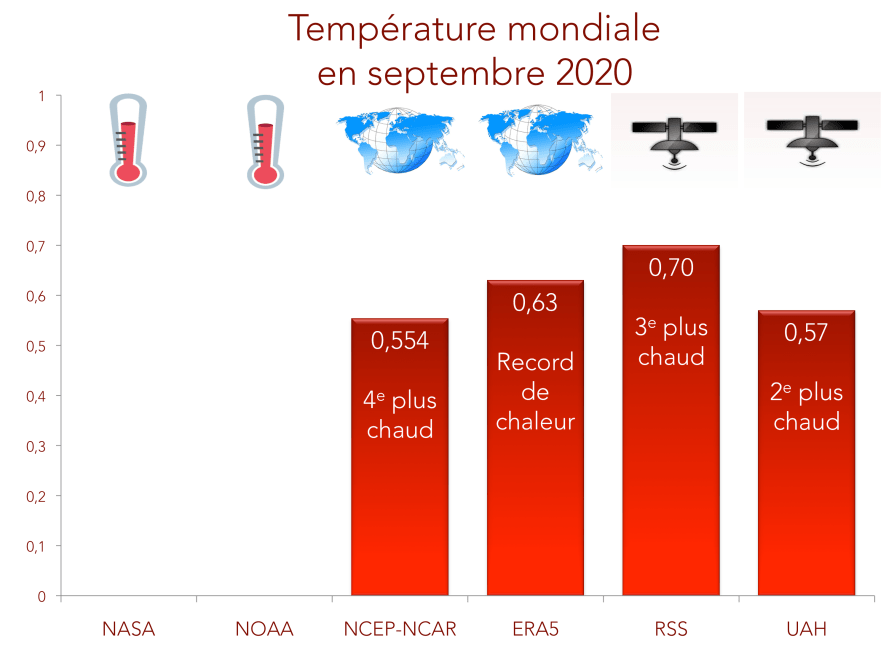 Cette page présente un bilan des archives du mois de septembre issues de six organismes mesurant la température de surface ou de la basse troposphère au niveau global : NASA GISTEMP, NOAA MLOST, NCEP-NCAR, ERA5, RSS, UAH. Ces archives utilisent normalement des périodes de référence et des méthodes distinctes. Les séries sont ici rapportées à la même période 1981-2010 et équitablement représentées selon leur source de récolte des données (thermomètres, réanalyses, satellites).