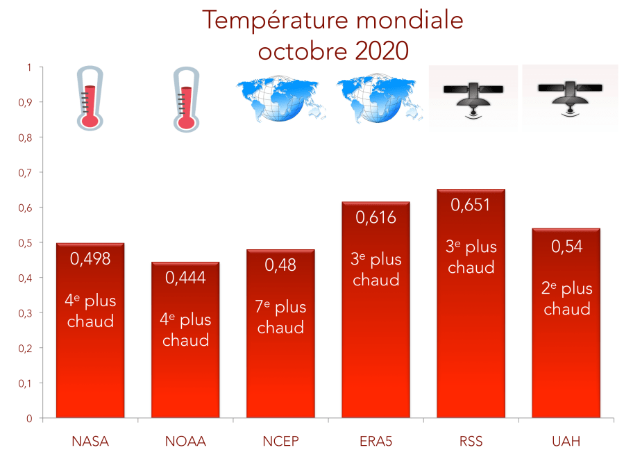 Les bilans de la NASA, NOAA, NCEP-NCAR, UAH, RSS et ERA5 pour le mois d’octobre sont désormais disponibles.