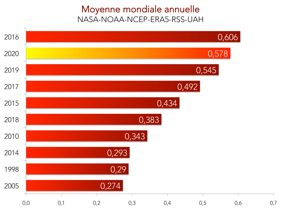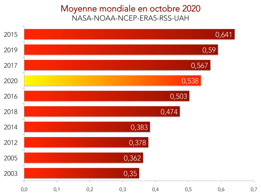 L’année en cours approche du record établi en 2016, d’après la moyenne NASA-NOAA-NCEP-ERA5-RSS-UAH. Le classement ci-dessous représente la moyenne annuelle (janvier-décembre) sauf pour 2020 (moyenne janvier-octobre). Selon les archives, 2020 sera plus ou moins proche du record de chaleur.