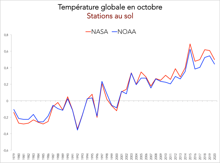 On peut voir ci-dessous l’évolution de la température globale au mois d’octobre par type de mesure de 1979 à 2020 :