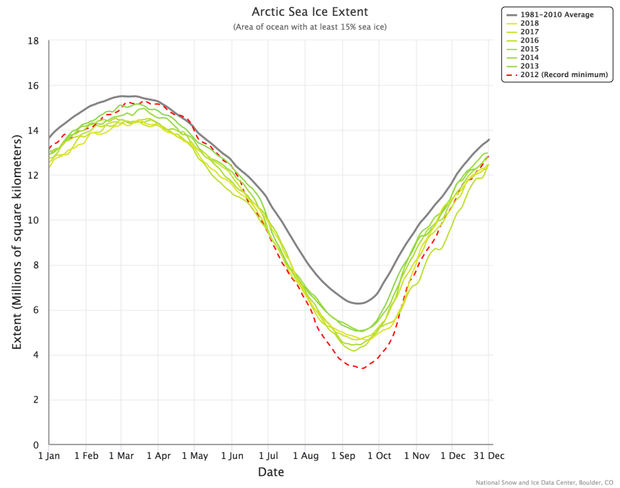 Extension de la glace de mer de l’Arctique pour l’année record 2012 (pointillés rouges) et les années de 2013 à 2018. Source : NSIDC.