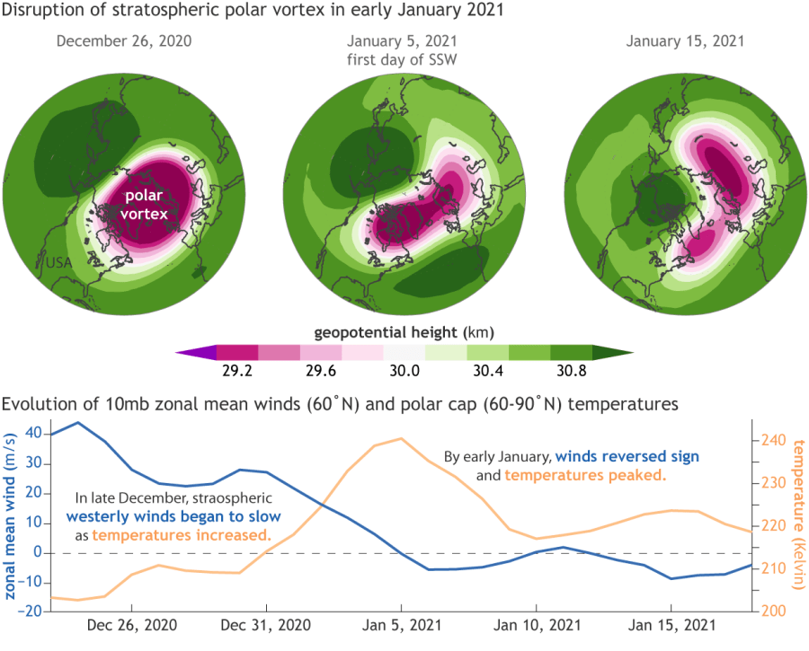 Autre phénomène important, un réchauffement stratosphérique soudain s’est produit entre fin décembre et début janvier. Comme cela se produit typiquement, le réchauffement stratosphérique a été suivi par une oscillation arctique et une oscillation nord-atlantique (NAO) fortement négatives pendant la majeure partie de janvier. Ces modèles sont généralement associés à des températures plus froides sur l’est des Etats-Unis et l’Europe. Ce qui s’est confirmé ce début d’année en Europe mais pas aux Etats-Unis. Les hautes pressions sur le Groenland se sont étendues vers le sud-ouest et ont amené des températures au-dessus des normales dans le nord des Etats-Unis. Les cartes ci-dessous montrent l’affaiblissement du vortex polaire stratosphérique et le changement de direction des vents à partir du 5 janvier, marquant le début de l’événement de réchauffement stratosphérique soudain.