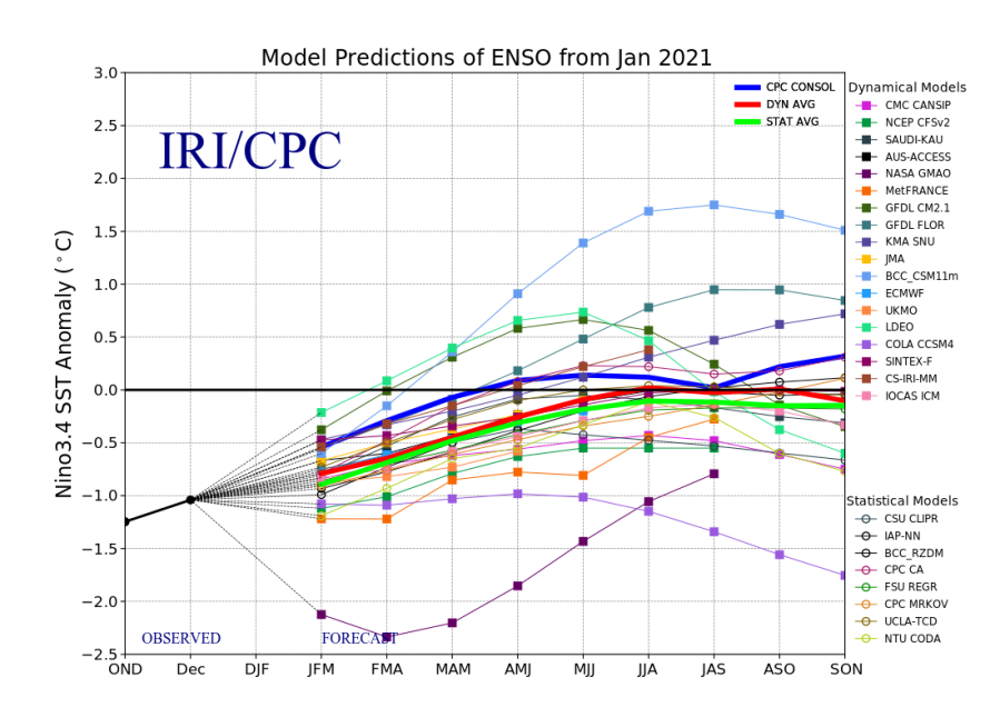 La plupart des modèles dynamiques et statistiques publiés récemment montrent des conditions La Niña modérées pour le reste de 2020, la plupart passant à des conditions La Niña faibles à la fin de l’hiver boréal et neutres au printemps. Le graphique suivant présente les prévisions faites par les modèles dynamiques et statistiques pour les températures de surface de la mer dans la région de Nino 3.4. La fiabilité des prévisions et la cohérence des modèles diminuent en fonction de l’éloignement de la cible.