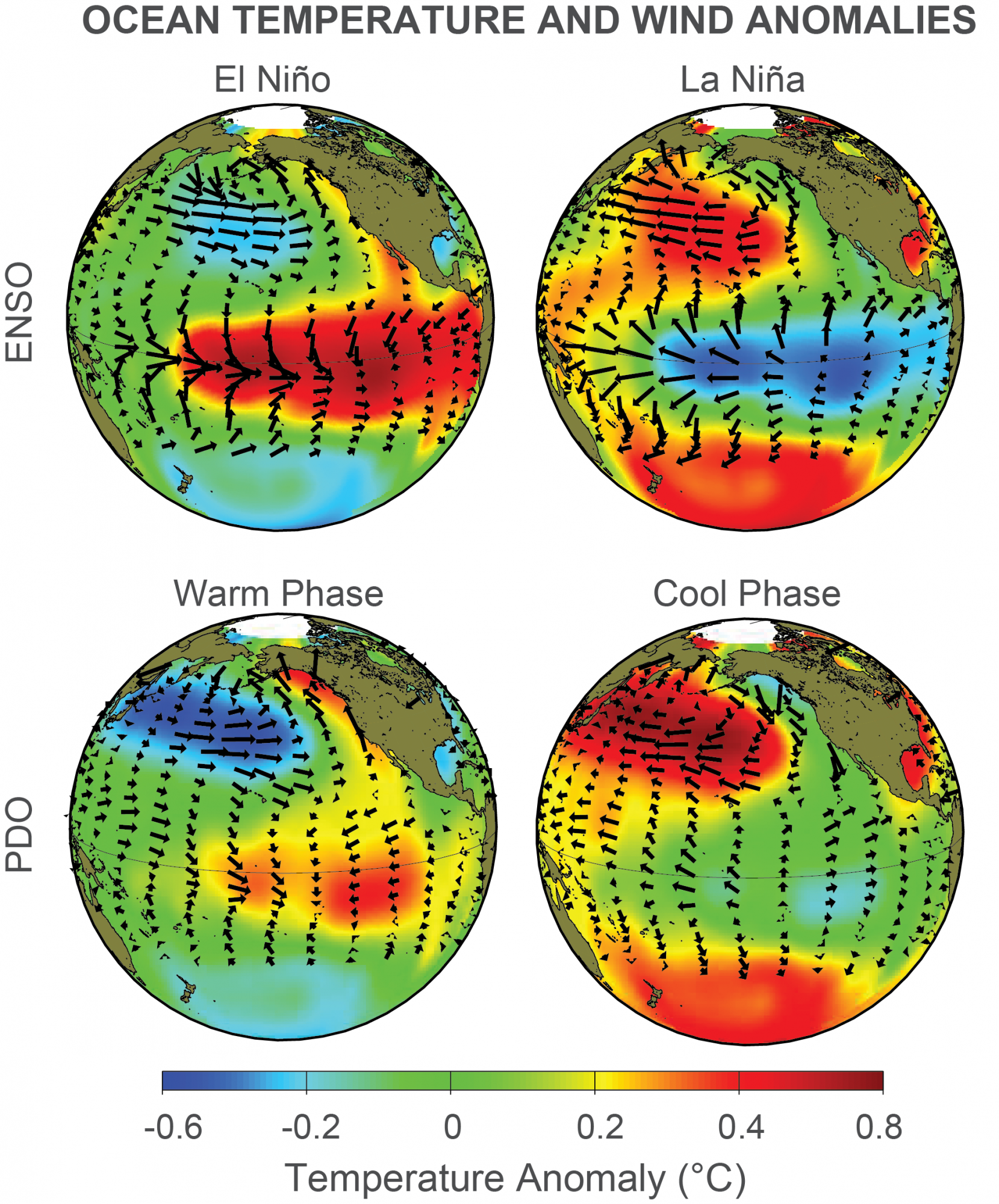 Anomalies typiques de température de surface de la mer (couleur) et anomalies de vent (flèches noires) observées pendant El Niño et La Niña (en haut) et les phases chaude et froide de l’oscillation décennale du Pacifique (PDO, en bas). Source : research.jisao.washington.edu