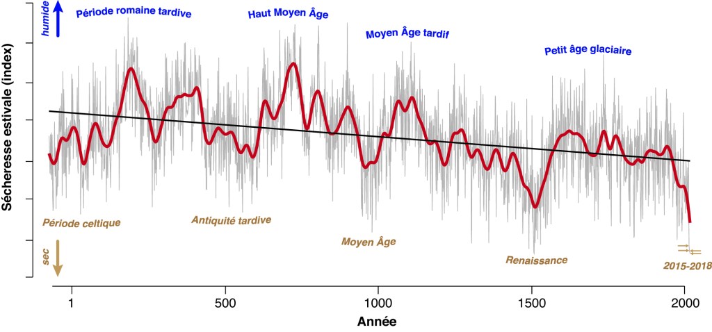 Je n’ai pas lu l’étude et je ne sais pas comment est calculée la courbe rouge, mais il n’est pas évident que la période actuelle soit plus sèche que la renaissance quand on regarde le graphe. Par contre, on voit bien la tendance de long terme.