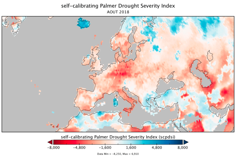On peut voir ci dessous le l’indice de sécheresse de Palmer pour les mois d’août 2003, 2015, 2018 et 2019. Cet indice plus connu sous le nom de PDSI (de l’anglais Palmer Drought Severity Index) est une mesure de la sécheresse fondée sur les précipitations et les températures.