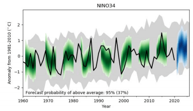 Selon le rapport de l’OMM, il y a 40% de chances de voir la température mondiale atteindre 1,5°C au-dessus du niveau préindustriel au cours des cinq prochaines années. Considérant la périodicité du phénomène El Niño, on pourrait penser logiquement que le prochain épisode El Niño surviendrait durant ces cinq années-là sachant que 2016 s’était inscrit auparavant comme l’année la plus chaude jamais enregistrée, avec +1,3 °C par rapport à l’ère préindustrielle.