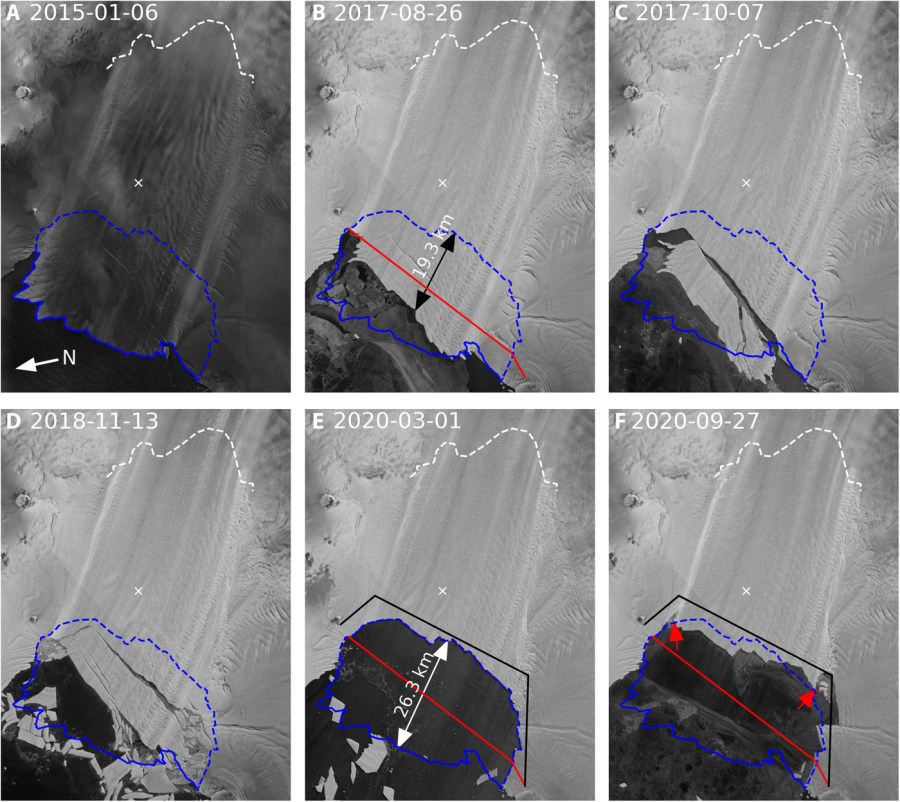 Les enregistrements de sédiments devant et sous la plateforme de glace de Pine Island indiquent que le front glaciaire est resté relativement stable pendant quelques milliers d’années. L’avancée régulière et les ruptures se sont produites à peu près au même endroit jusqu’en 2017, puis se sont successivement aggravées chaque année jusqu’en 2020.