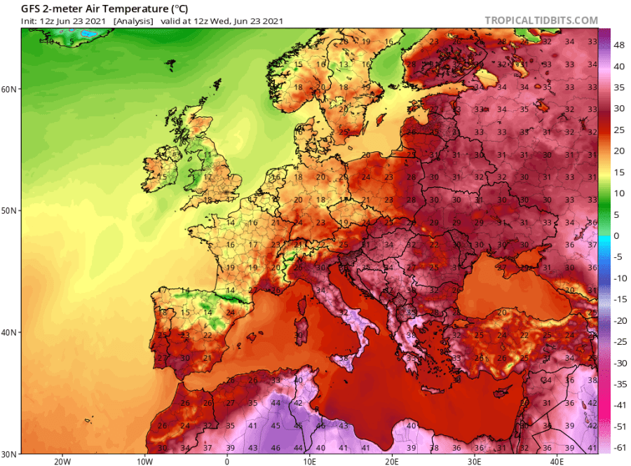 Le 20 juin, l’Allemagne a connu son 4è jour consécutif avec des températures maximales de plus de 35°C. Le 21 juin, 62 stations autrichiennes ont vécu une nuit tropicale (avec des températures minimales au-dessus de 20°C). C’est pourtant un endroit du globe où des nuits tropicales aussi précoces sont rares.