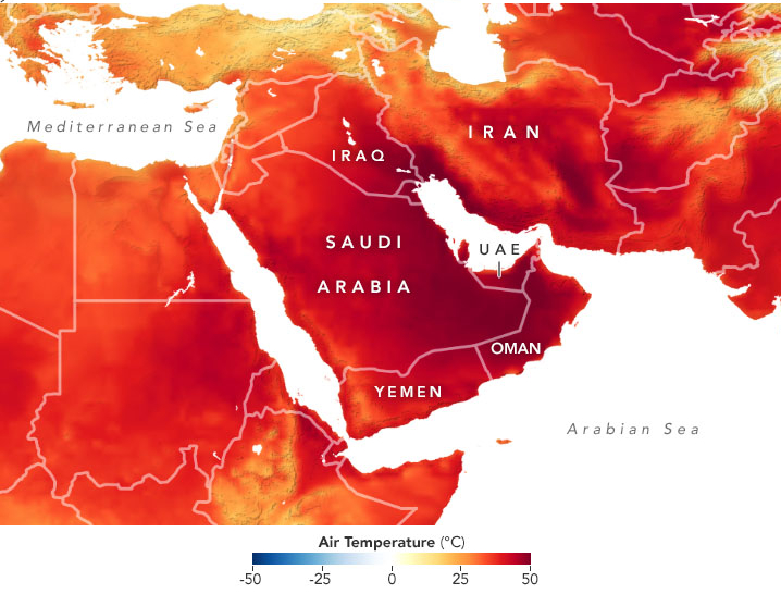 Le Moyen-Orient a enregistré des valeurs exceptionnellement élevées pour un mois de juin. Les stations au sol locales ont relevé des températures dépassant la barre des 50°C dans au moins quatre pays du Moyen-Orient, dont l’Iran, le Koweït, Oman et les Emirats Arabes Unis.