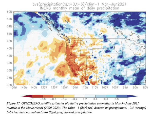 Une autre caractéristique importante de cette vague de chaleur extrême est qu’elle s’est produite après un printemps très sec sur l’ouest des Etats-Unis, de sorte que l’absence de refroidissement par évaporation a pu être un facteur dans les températures exceptionnelles observées.