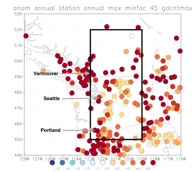 Des scientifiques des Etats-Unis, du Canada, du Royaume-Uni, des Pays-Bas, de France, d’Allemagne et de Suisse se sont penchés sur la question souvent controversée de « l’attribution » de l’événement extrême. L’attribution consiste à déterminer l’influence possible du changement climatique sur les événements météorologiques extrêmes. La région étudiée (45-52 ºN, 119-123 ºW) comprend les villes de Seattle, Portland et Vancouver. La case noire ci-dessous indique la zone concernée.