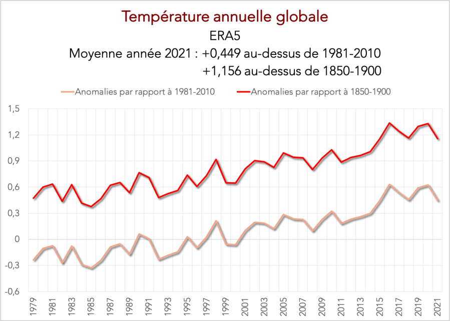 Pour calculer la température mondiale par rapport à la période préindustrielle, il faut utiliser une autre archive que celle d’ERA5 car celle-ci remonte à 1979. Cette archive du Met Office présente l’avantage de remonter aux années 1850. HadCRUT5 a récemment remplacé HadCRUT4 avec des améliorations dans la couverture globale et la mesure des températures de surface de la mer. Avec la même méthodologie, l’Organisation Météorologique Mondiale (OMM) utilise les données de HadCRUT4 pour produire des estimations des archives qui ne remontent pas à la période préindustrielle. L’OMM combinera sans doute ERA5 avec HadCRUT5 dans ses prochaines estimations. Les données de HadCRUT5 seront désormais utilisées ici pour calculer l’évolution d’ERA5 par rapport à la période préindustrielle (1850-1900).