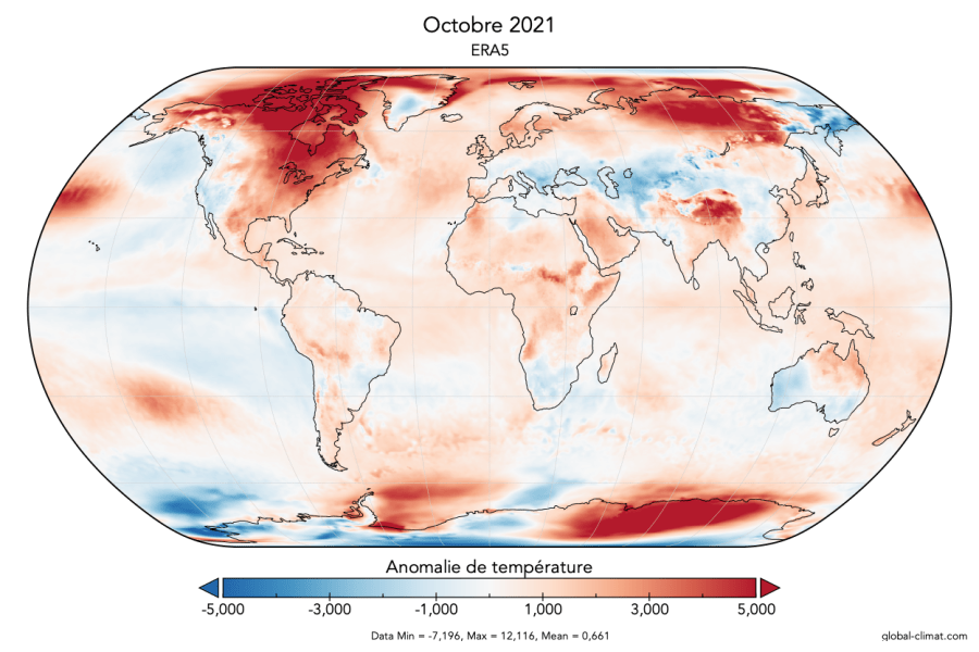Avec +0,661°C au-dessus de la moyenne 1981-2010, le mois d’octobre 2021 est le 3e plus chaud des archives ERA5.