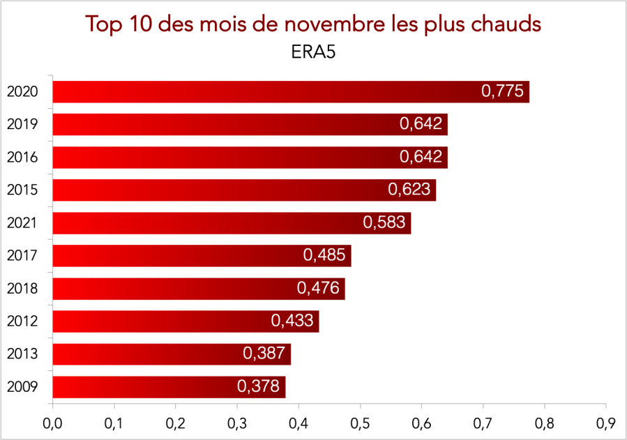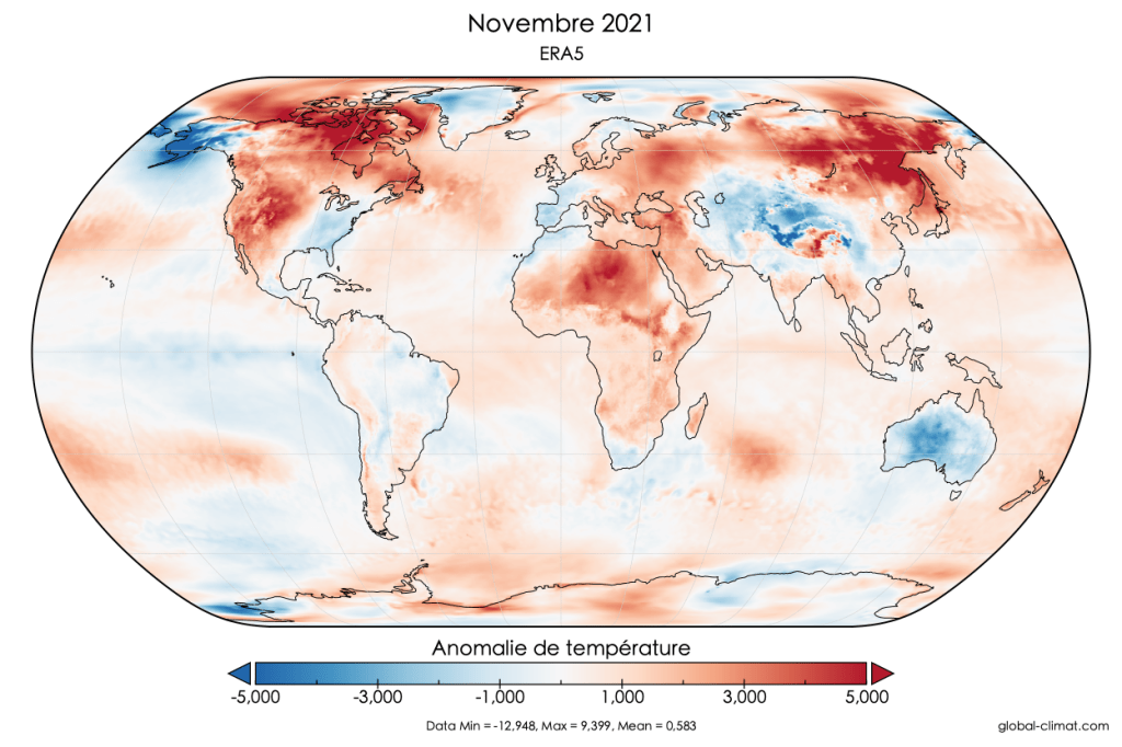 Avec +0,583°C au-dessus de la moyenne 1981-2010, le mois de novembre 2021 est le 5e plus chaud des archives ERA5.