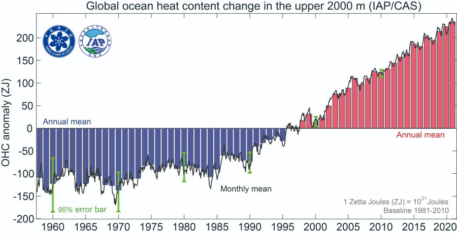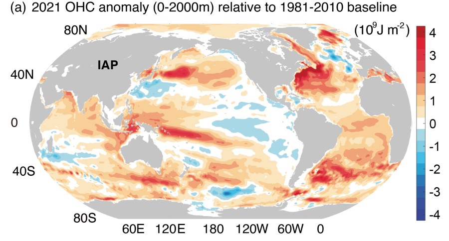 Le contenu en chaleur en 2021 est supérieur à celui de 2020 de 14 ZJ, d’après les données IAP / CAS et de 16 ZJ d’après NOAA / NCEI. Il s’agit de données préliminaires qui seront complétées par des données de profil océanique qui ne sont pas immédiatement disponibles à la fin de l’année et par des processus d’étalonnage et de contrôle de la qualité qui se produisent également sur des échelles de temps plus longues.  Les données de 2020 ont été ainsi légèrement revues à la baisse dans la présente étude par IAP mais restent inchangées pour la NOAA.
