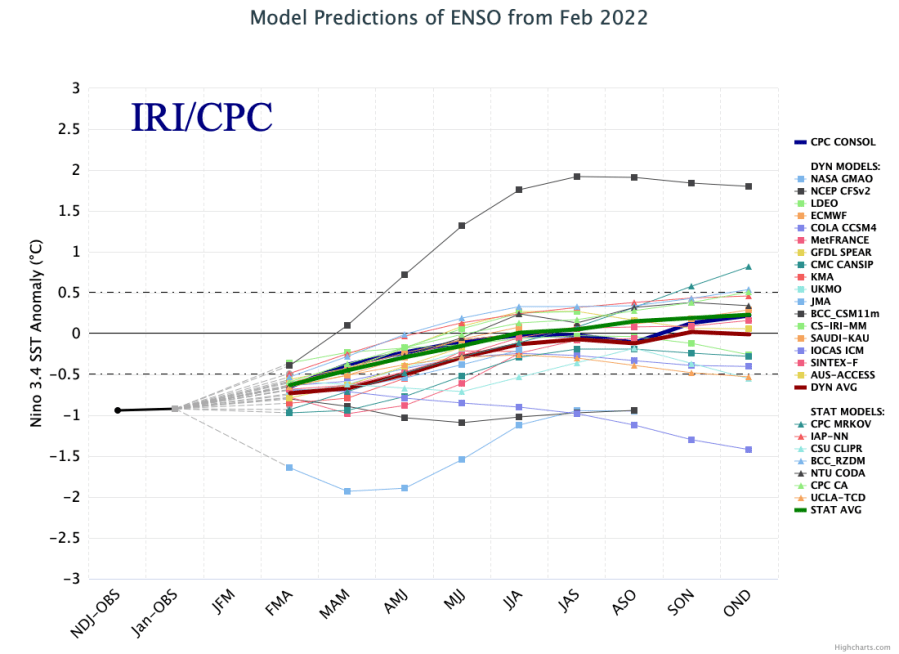 Des conditions La Niña sont donc actuellement présentes dans le Pacifique avec – 0,89°C dans la région Niño 3.4 en février 2022, qui suivent -0,95°C en janvier 2022. D’après la NOAA, La Niña devrait se maintenir dans les premiers mois de 2022, puis on pourrait opérer une transition vers des conditions neutres à partir du mois de mai. Le graphique ci-dessous montre les prévisions pour la région Niño 3.4. Les modèles se heurtent à la barrière de prévisibilité du printemps. Cela signifie que tant que le printemps ne sera pas passé, les prévisions resteront aléatoires.