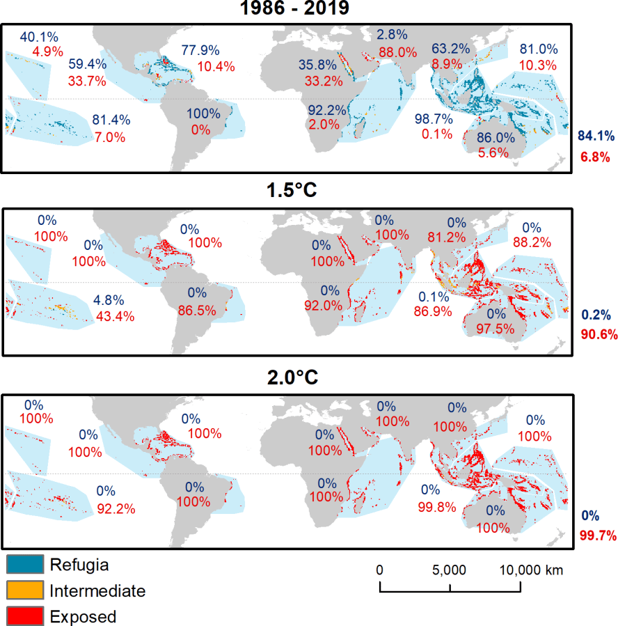 D’après une étude publiée dans la revue PLOS Climate, de 1986 à 2019, 84 % des récifs du monde offraient un refuge thermique suffisant. Cela signifie que les coraux avaient suffisamment de temps pour se rétablir entre deux épisodes de blanchissement. Avec un réchauffement climatique de 1,5 °C par rapport aux niveaux préindustriels, il ne resterait plus que 0,2 % de ces refuges. À 2°C de réchauffement, les refuges thermiques des récifs coralliens n’existeront plus.