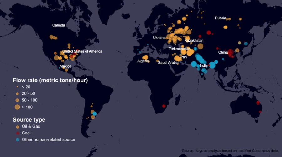 Le méthane, deuxième facteur de réchauffement de la planète après le dioxyde de carbone, est généré par la production, le transport et l’utilisation de combustibles fossiles, mais aussi par la décomposition des matières organiques dans les zones humides et comme sous-produit de la digestion des ruminants dans l’agriculture. L’une des principales sources d’émissions de méthane d’origine humaine est l’industrie pétrolière et gazière.
