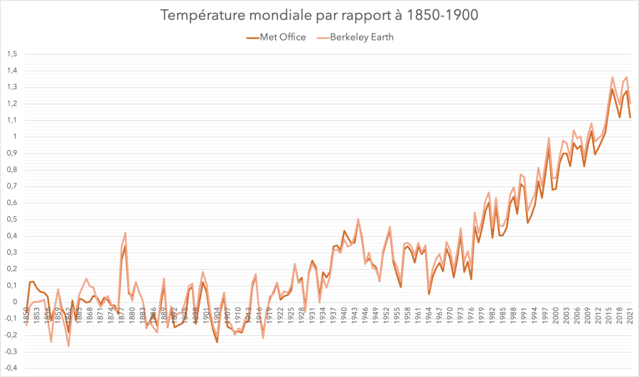 Anomalies de température annuelle par rapport à la moyenne 1850-1900. Sources : Met Office (HadCRUT5) ; Berkeley Earth.