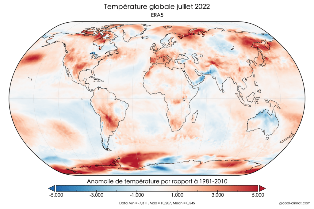 Avec +0,545°C au-dessus de la moyenne 1981-2010, le mois de juillet 2022 est le 2e plus chaud des archives ERA5.