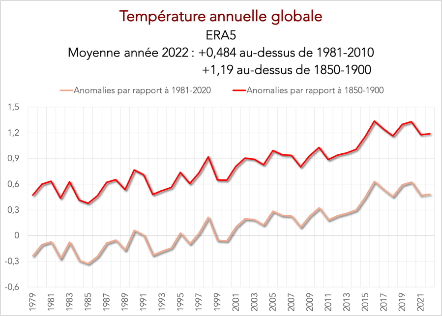 L’anomalie de +0,545°C observée au mois de juillet 2022 par rapport à 1981-2010 correspond à une anomalie de +1,14°C par rapport à 1850-1900. Si l’anomalie observée sur janvier-juillet se maintenait toute l’année, la température globale sur l’ensemble de 2022 serait de +1,19°C au-dessus de la période préindustrielle. Les deux années les plus chaudes ont été 2016 et 2020 avec respectivement +1,337°C et +1,33°C.