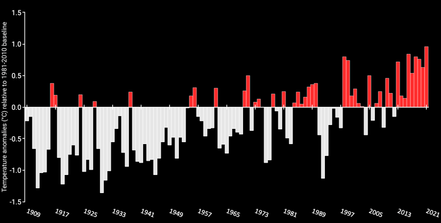 Anomalies de température annuelle de 1909 à 2021 en Nouvelle-Zélande. Source : NIWA