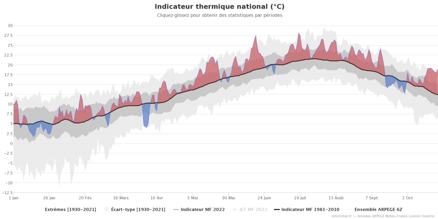 Il ne s’agit pas d’un épiphénomène puise que depuis le début de l’année, la température moyenne en France est également à un niveau record avec 15.6°C, devant la période 1er janvier-23 octobre 2020 (15.21°C). 2022 est pour le moment 0.7°C au-dessus de 2003.