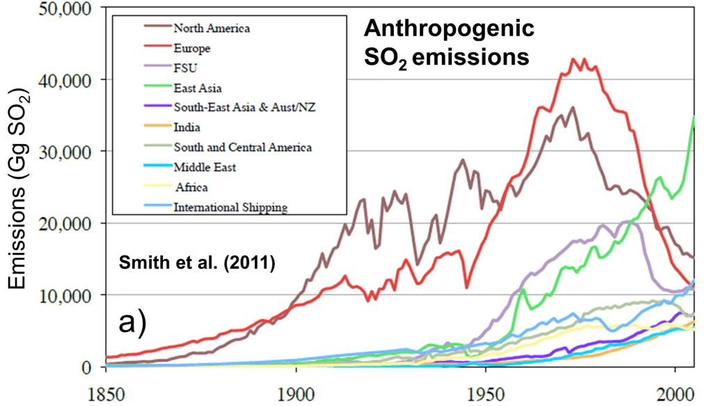 Le graphique ci-dessous montre l’évolution des émissions de SO2 anthropiques par région.