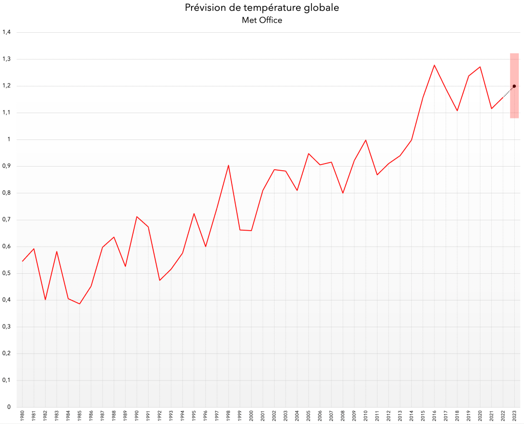 Le graphique suivant montre la moyenne des observations jusqu’à 2022 ainsi que la prévision du Met Office pour 2023, à savoir une valeur centrale de +1,20°C avec une fourchette de +1,08°C à +1,32°C.