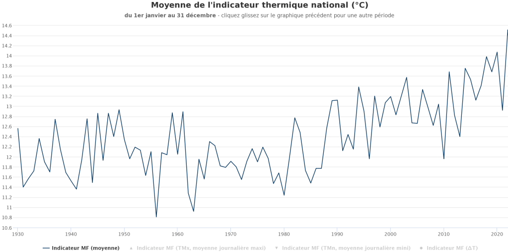 Moyenne annuelle des températures d’après l’Indicateur thermique national pour la France de 1930 à 2022. Source : Infoclimat