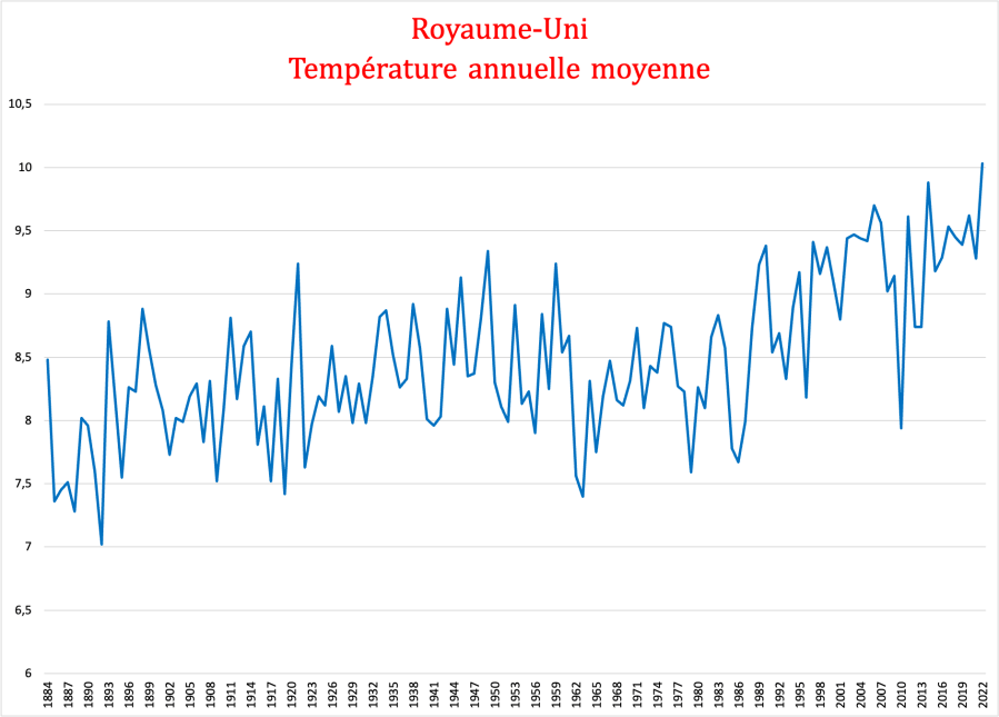 Moyenne annuelle des températures pour le Royaume-Uni de 1884 à 2022. Source : Met Office