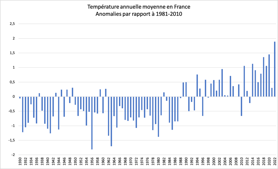 En France, l’année écoulée se solde par un record de température moyenne avec 14,51°C, nettement devant le précédent maximum de 2020 (14,07°C).