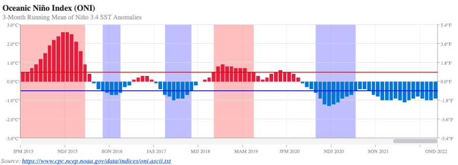 La carte pour l’année 2022 dans son ensemble, ci-dessous, montre bien les températures de surface de la mer plus froides que la moyenne dans l’est du Pacifique, signe de conditions La Niña.