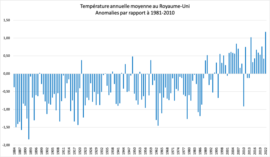 Au Royaume-Uni, le record est également battu en 2022, d’après le Met Office. La température moyenne atteint 10,03°C sur l’année 2022. C’est la première fois que la barre des 10°C est franchie. L’Angleterre (10,94°C), le Pays-de-Galles (10,23°C), l’Ecosse (8,5°C) et l’Irlande du Nord (9,85°C) pris individuellement affichent tous des records. L’Irlande (l’Etat indépendant du Royaume-Uni) a aussi enregistré l’année la plus chaude de ses archives avec une moyenne de 10,8°C, d’après Met Eireann.