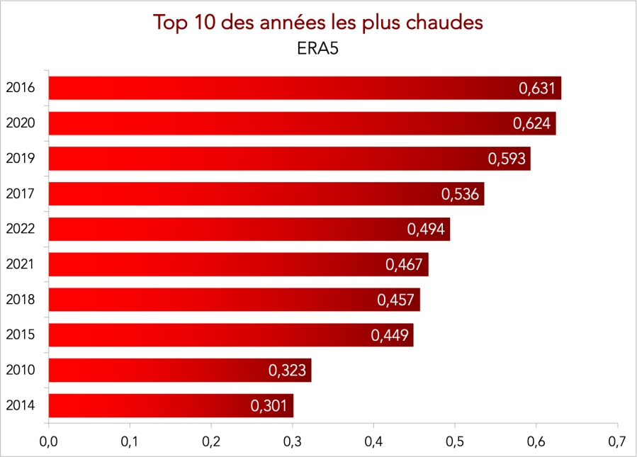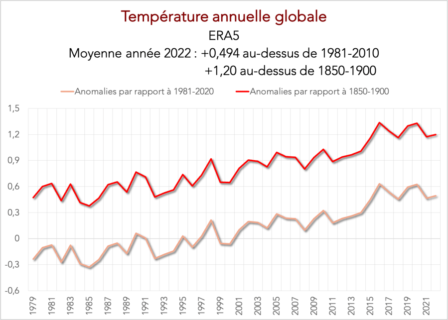 L’année 2022 a été marqué par une anomalie de +1,20°C par rapport à 1850-1900, d’après la combinaison entre ERA5 et HadCRUT5. Les deux années les plus chaudes ont été 2016 et 2020 avec respectivement +1,337°C et +1,33°C.