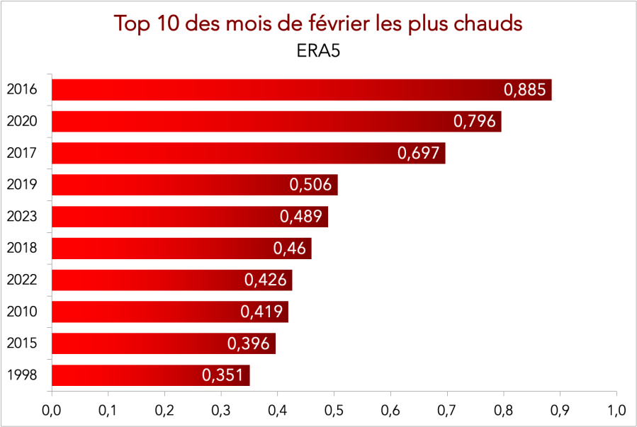 Avec +0.489°C au-dessus de la moyenne 1981-2010, le mois de février 2023 est le 5e plus chaud des archives ERA5.