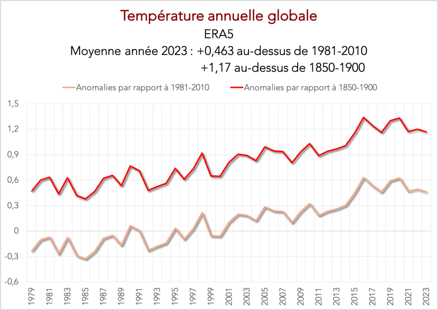 Pour calculer la température mondiale par rapport à la période préindustrielle, il faut utiliser une autre archive que celle d’ERA5 car celle-ci remonte à 1979 seulement. L’archive du Met Office présente l’avantage de remonter aux années 1850. HadCRUT5 a récemment remplacé HadCRUT4 avec des améliorations dans la couverture globale et la mesure des températures de surface de la mer. Les données de HadCRUT5 sont utilisées ici pour calculer l’évolution d’ERA5 par rapport à la période préindustrielle (1850-1900).