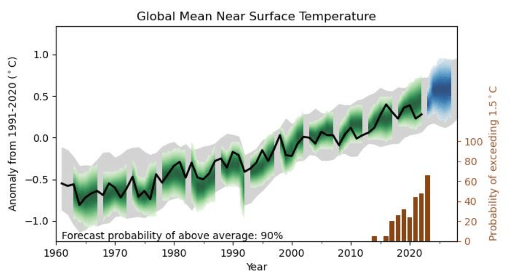D’après la mise à jour mondiale annuelle à décennale sur le climat produite par le Met Office et l’Organisation météorologique mondiale, les cinq prochaines années (2023-2027) seront très probablement (98% de chances) plus chaudes que la moyenne des cinq dernières années (2018-2022). La probabilité de voir un record de chaleur dans les 5 prochaines années est également de 98%. A noter que sur le graphique ci-dessous, la période de référence est 1991-2020, qui est déjà 0.88°C plus élevée que la période 1850-1900.