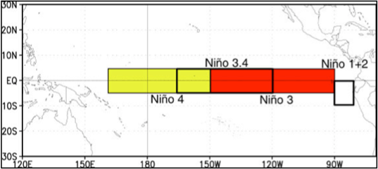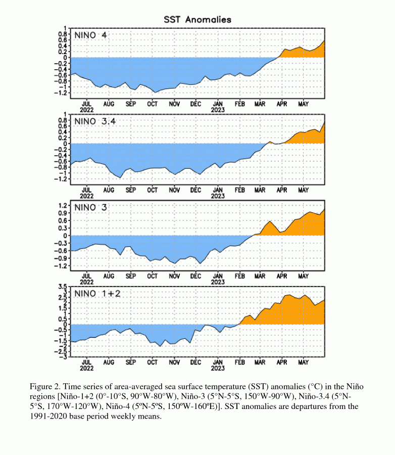 Tous les derniers indices hebdomadaires de température de surface de la mer pour les régions Niño du Pacifique sont supérieurs à +0,5°C : « Niño-3.4 » à +0,8°C fin mai, « Niño-3 » à +1,1°C et « Niño1+2 » à +2,3°C. Chaque indice est associé à une zone spécifique de l’océan et donne une indication de l’intensité et de la position du phénomène El Niño.