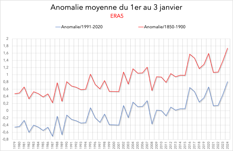 Par exemple, pour calculer l’anomalie du 1er au 3 janvier 2024 par rapport à 1850-1900, j’utilise l’anomalie d’ERA5 par rapport à 1991-2020 (+0,81°C), à laquelle j’aoute la moyenne des références préindustrielles pour janvier (+0,93°C), ce qui donne +1,74°C. C’est la méthode utilisée par Copernicus et l’ECMWF. Ce qui donne le graphique suivant :